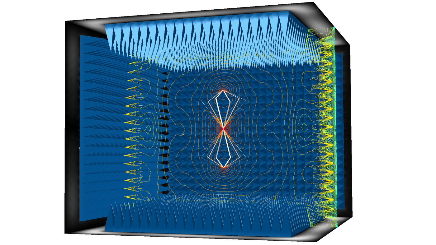 A COMSOL model for studying microwave absorption in an anechoic chamber. A biconical antenna, often used in EMI/EMC testing, is at the center of an anechoic chamber. The far-field radiation pattern and S-parameter in the model show that the walls' reflection is significantly reduced without distorting antenna performance.