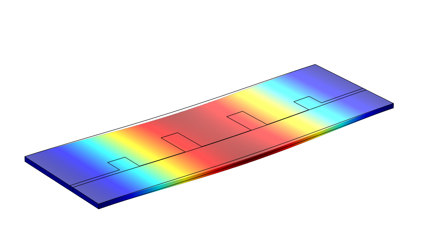 A COMSOL Multiphysics model of a low-pass microwave filter on a PCB. The S-parameters of a low-pass microwave filter on a printed circuit board (PCB) are computed in this model. The model also considers the effect of mechanical deformation based on the placement and length of the stubs along the microstrip line.